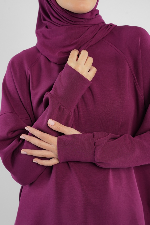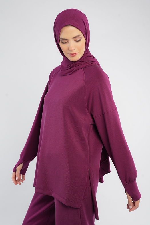 Long sweatshirt and matching wide-leg pants set in premium modal scuba that feels extra-soft, breathable, and naturally cooling on the skin. The top is cut with relaxed drop shoulders and a modest high-low hem that falls longer at the back for extra coverage, with side slits for ease of movement and a flattering drape.