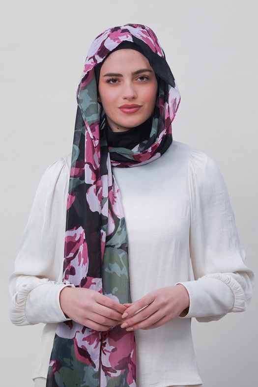 • FREESTYLE hijab is a one piece pre-sewn long rectangular shawl. Made of printed chiffon and lined with 100% cotton for opacity and structure. Match it with the straight Bokitta Inner or Cross Inner