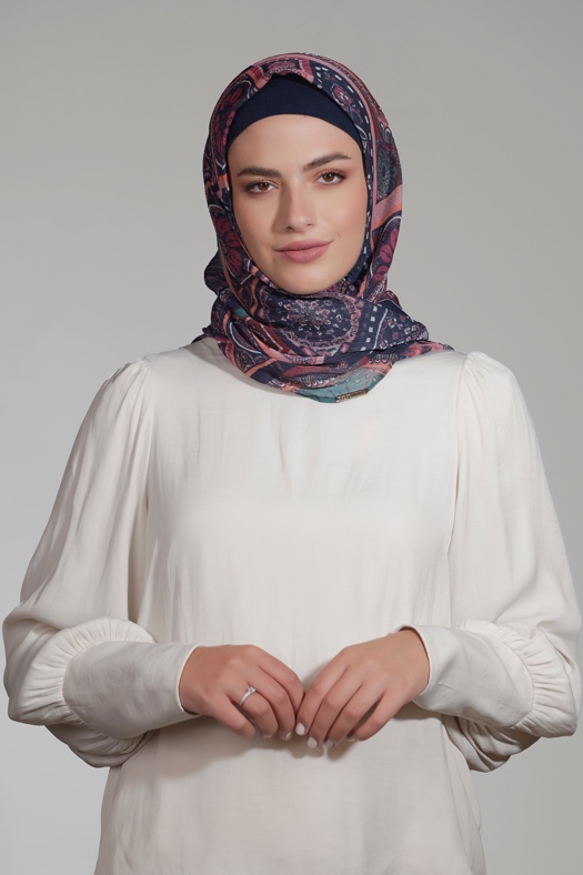 • FREESTYLE hijab is a one piece pre-sewn long rectangular shawl. Made of printed chiffon and lined with 100% cotton for opacity and structure. Match it with the straight Bokitta Inner or Cross Inner